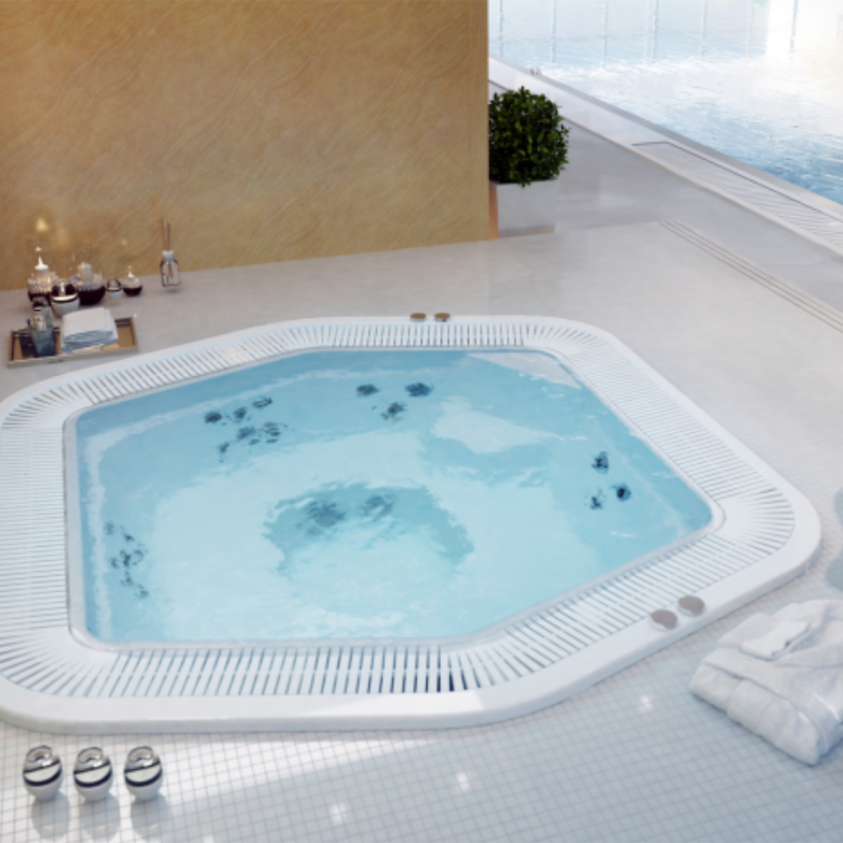 This model is well-suited for hotels, spa and wellness centres, and larger pool facilities. The integrated entry and exit corner in the shell design improves accessibility and helps create a safer, more enjoyable bathing experience for guests.