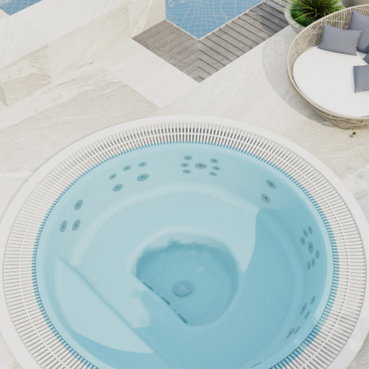 The Mila with Gutter is a circular, fully commercial spa bath designed for popular spaces. Measuring Ø 2.50 x 0.85m, there’s room for seven adults, and the premium-quality acrylic shell ticks strength and long-term durability.